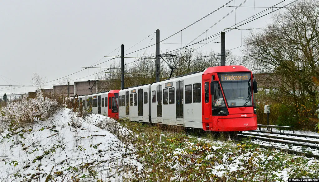 HF6 5327 befindet sich im Liniendienst. Hier als Linie 4 zusammen mit 5319 auf dem Weg zur Leyendeckerstraße kurz vor der Haltestelle Mülheim Berliner Straße am 30.11.2023.