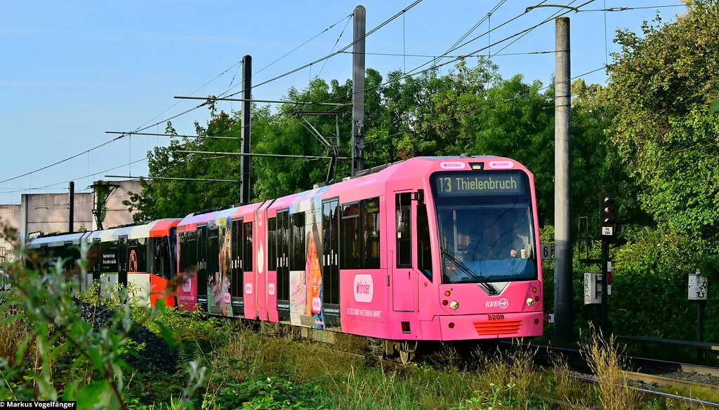 2322(Richmodis Kölsch auf Wagenteil 2) und 2330 (IceBar Cologne auf Wagenteil 1) wurden neue Segment-Reklamen angebracht. Hier zu sehen an der Haltestelle Reichenspergerplatz am 25.10.2023.