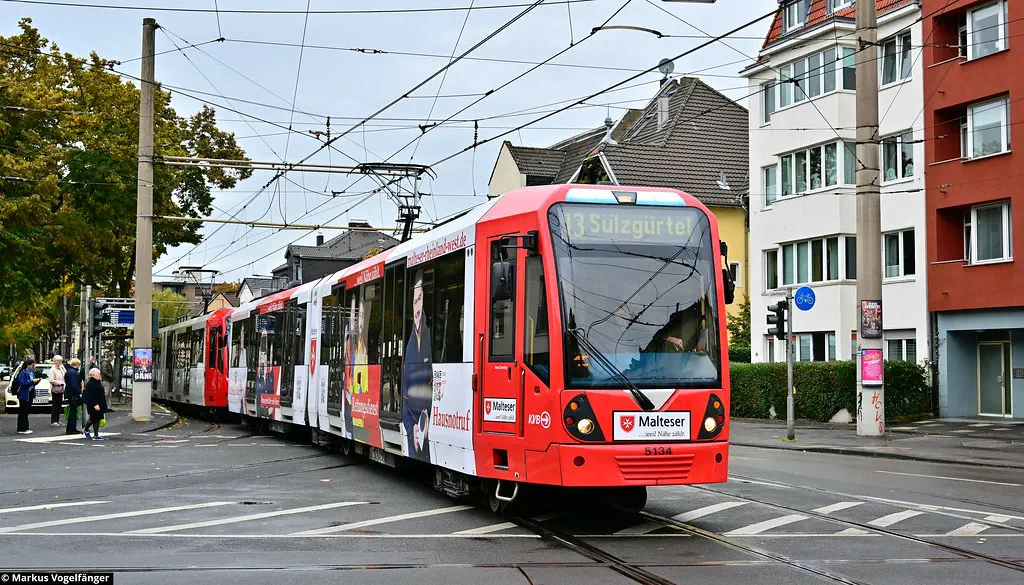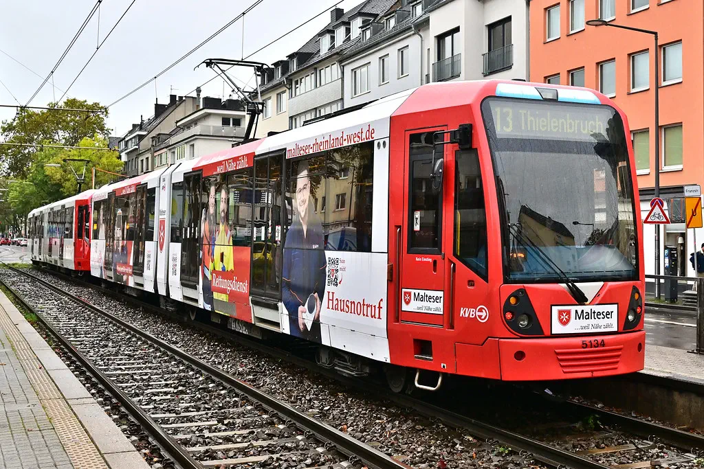 5134 wurde eine neue Ganz-Reklame "Malteser" angebracht. Hier an der Haltestelle Appellhofplatz/Zeughaus am 16.10.2023.