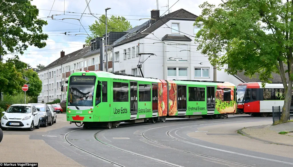 5111 wurde eine neue Ganz-Reklame "Uber Eats" angebracht. Hier zu sehen an der Haltestelle "Sparkasse, Am Butzweilerhof" und auf der Margaretastraße am 26.08.2023.