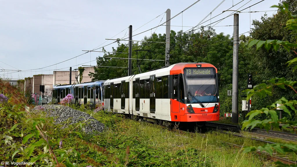 2031 und 2032 während der Anreise zum Öffnungstag des Straßenbahn-Museums Thielenbruch auf der Hochbahn und in Holweide am 13.08.2023.