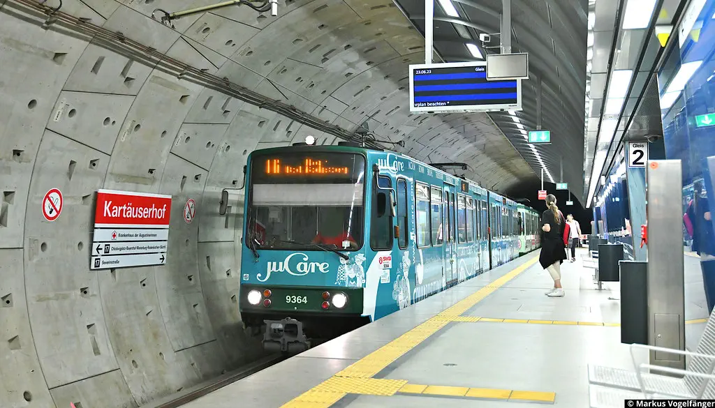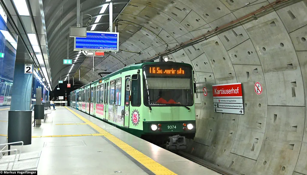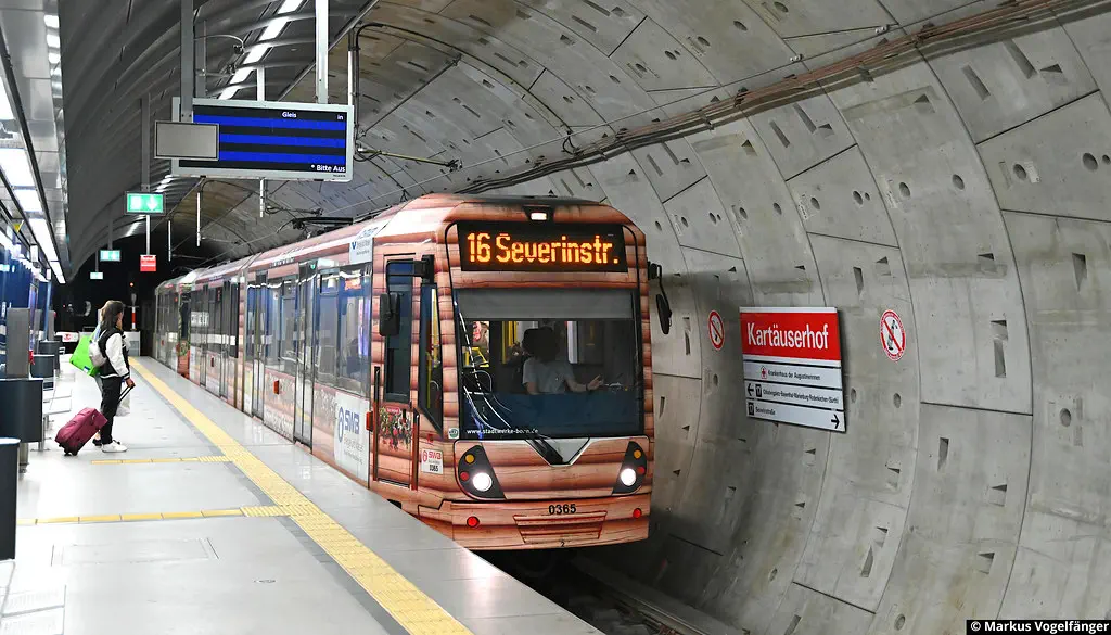 Vom 22.06.2023 bis zum 01.07.2023, Betriebsbeginn wird die Linie 16 aufgrund von Gleisbauarbeiten auf dem Übergang Rheinuferstraße/Ubierring getrennt. Dabei verkehrt der südliche Teil der Linie 16 zwischen Bonn/Wesseling/Sürth und Severinstraße. Der nördliche Teil verkehrt zwischen Niehl, Sebastianstraße und Ubierring. Umsteigemöglichkeit zwischen beiden Linienteilen besteht am Chlodwigplatz. Hier die Bonner Fahrzeuge 9364, 9374, 0365 und der Duewag B80D-Prototyp 2201 im Nord-Süd-Stadtbahntunnel an der Haltestelle Kartäuserhof am 23.06.2023.