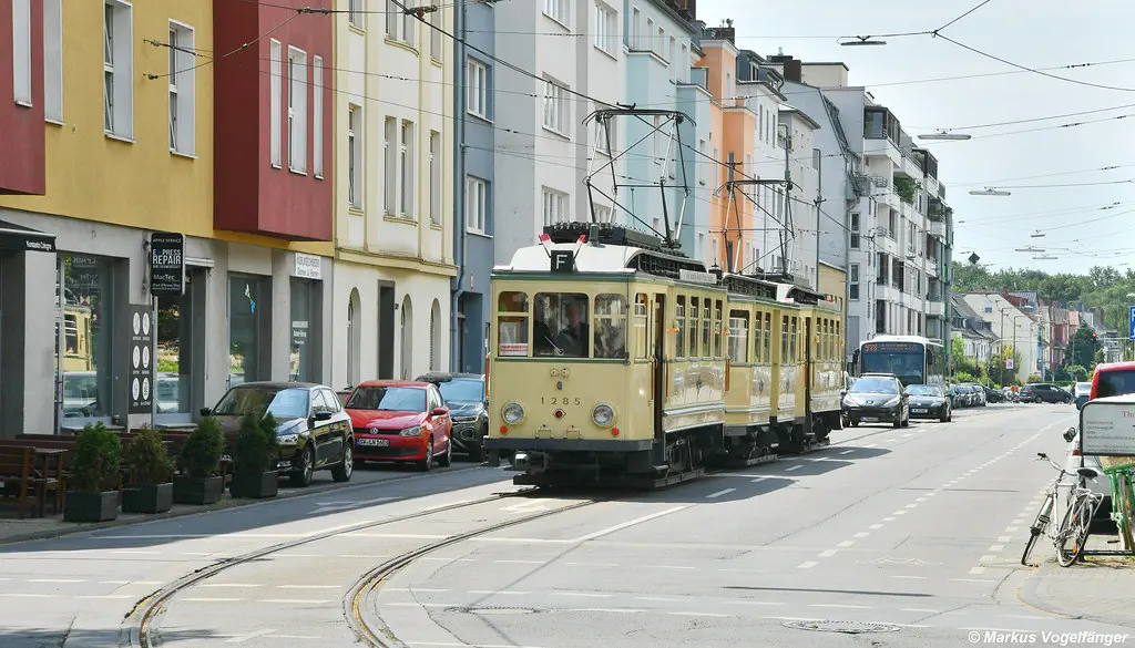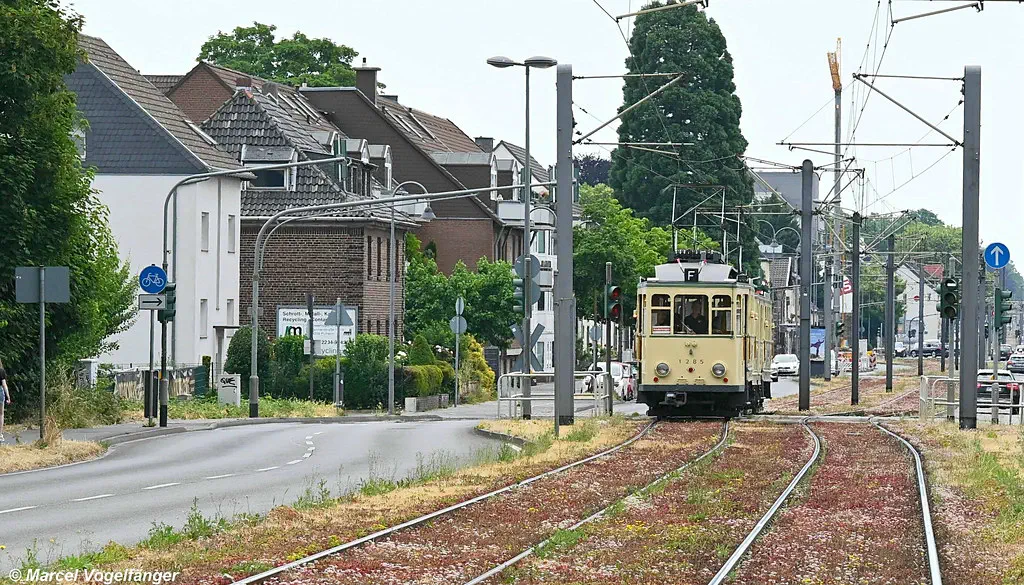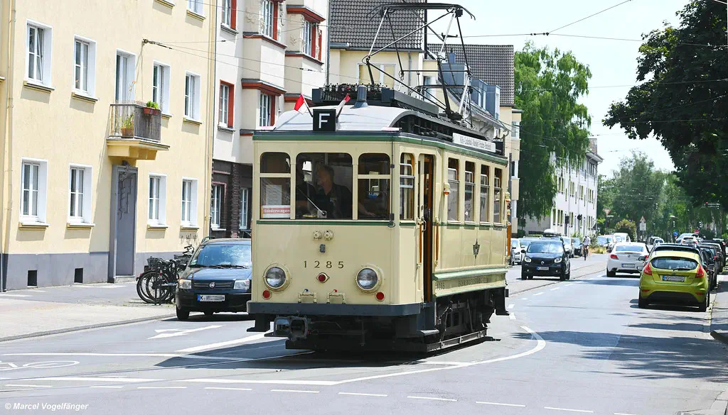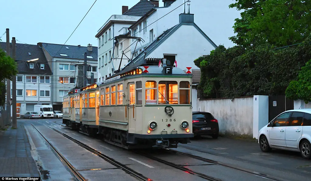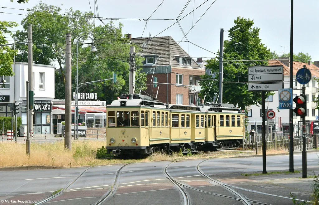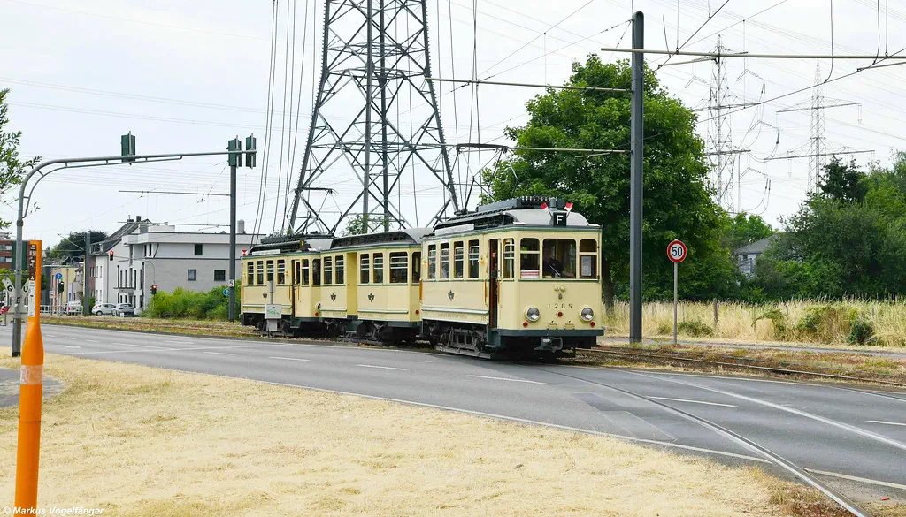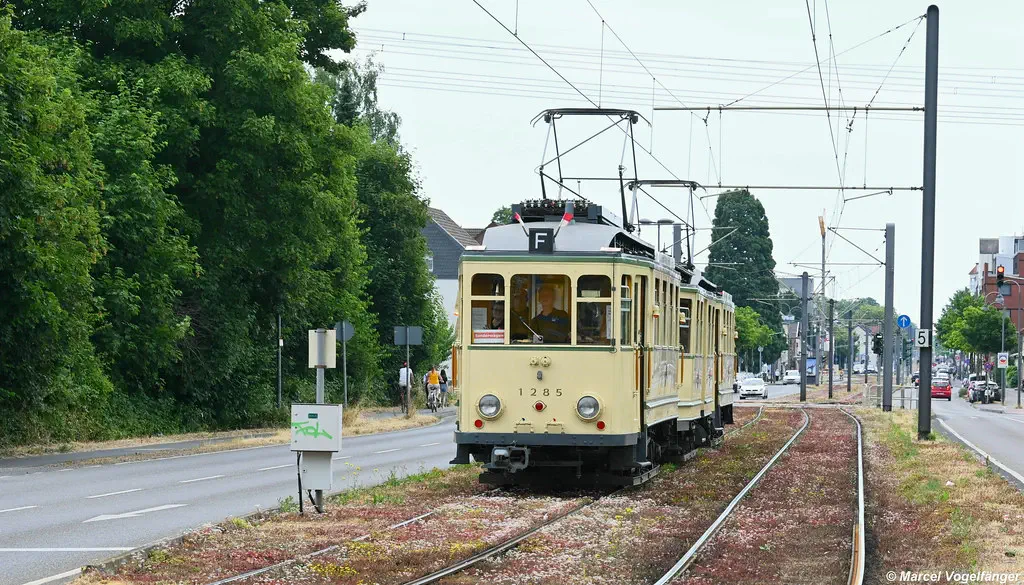 Der Museumszug Finchen (1285/1257/1286) wurde nach erfolgreicher Technik-Instandsetzung in der KVB-Hauptwerkstatt zurück ins Straßenbahn-Museum überführt. Hier zu sehen auf dem Weg nach Hause ins Straßenbahn-Museum Thielenbruch auf der Neusser Straße und Simonskaul am 11.05.2023