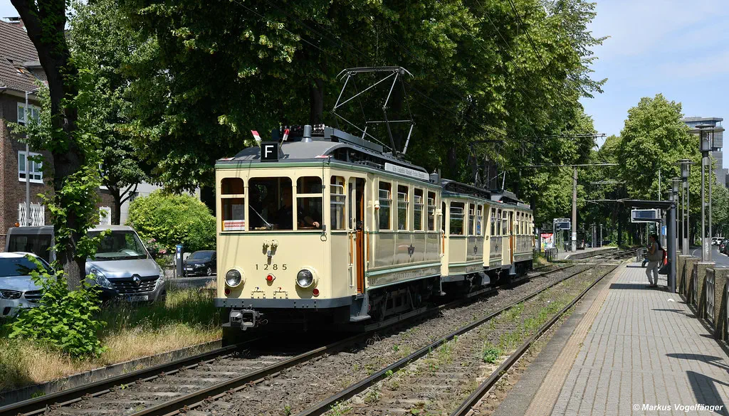 Der Museumszug "Finchen" (1285/1257/1286) auf dem Weg ins Straßenbahn-Museum Thielenbruch an der Haltestelle Breslauer Platz/Hauptbahnhof am 04.06.2023.