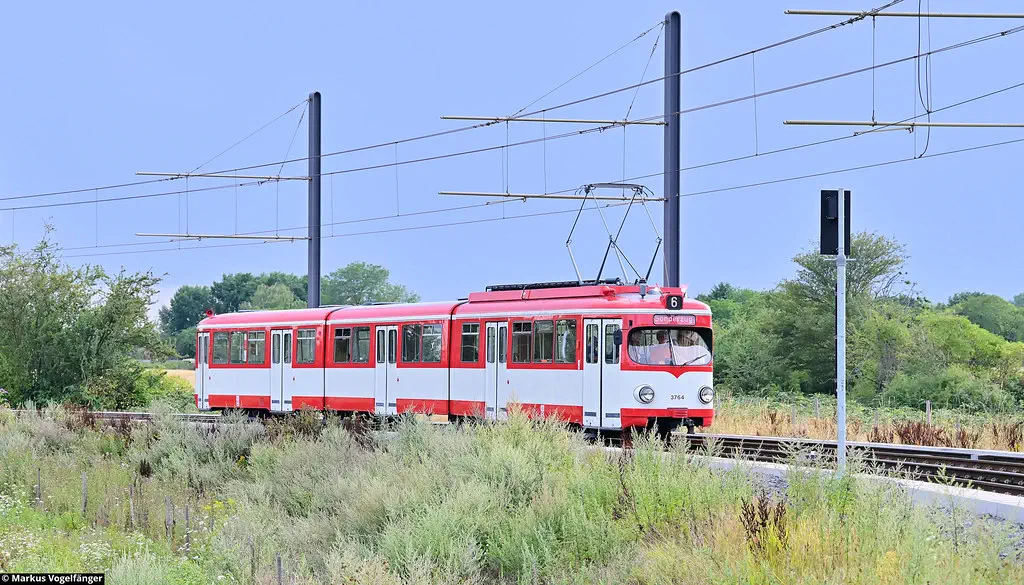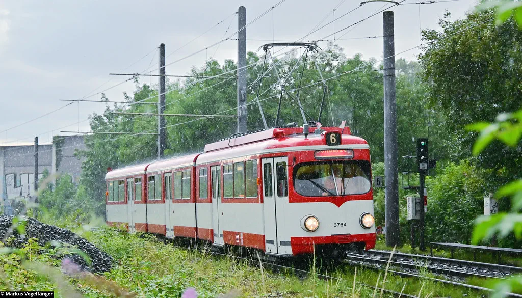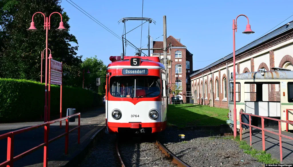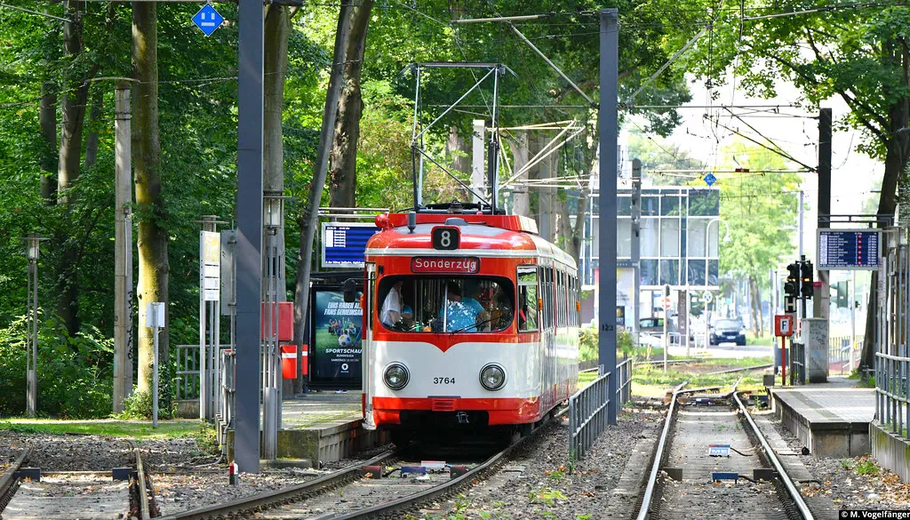3764 wurde vom Straßenbahn-Museum Thielenbruch über die Hochbahn zum Betriebshof West überführt. Anbei einige Bilder auf Höhe der Geldernstraße und auf dem Betriebshof West am 06.08.2023.
