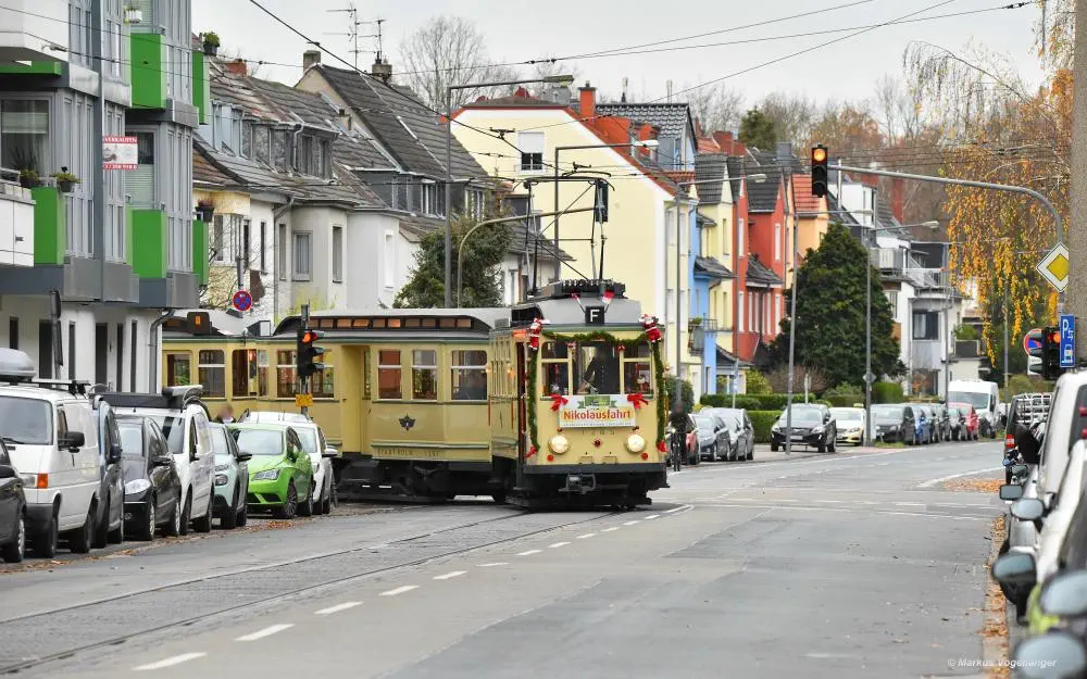 Der historische Museumszug Finchen (bestehend aus 1285, 1257 und 1286) auf der Kreuzung Berrenrather Straße/Neuenhöfer Allee am 01.12.2019.