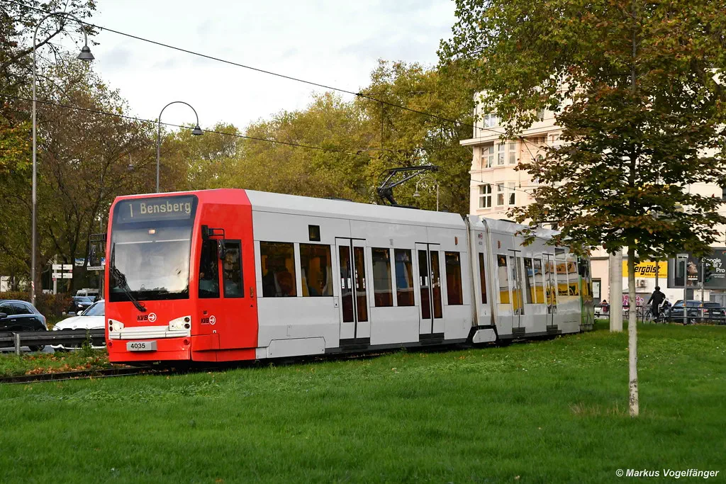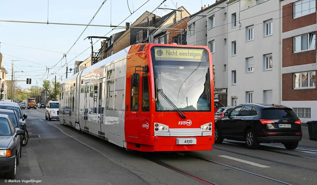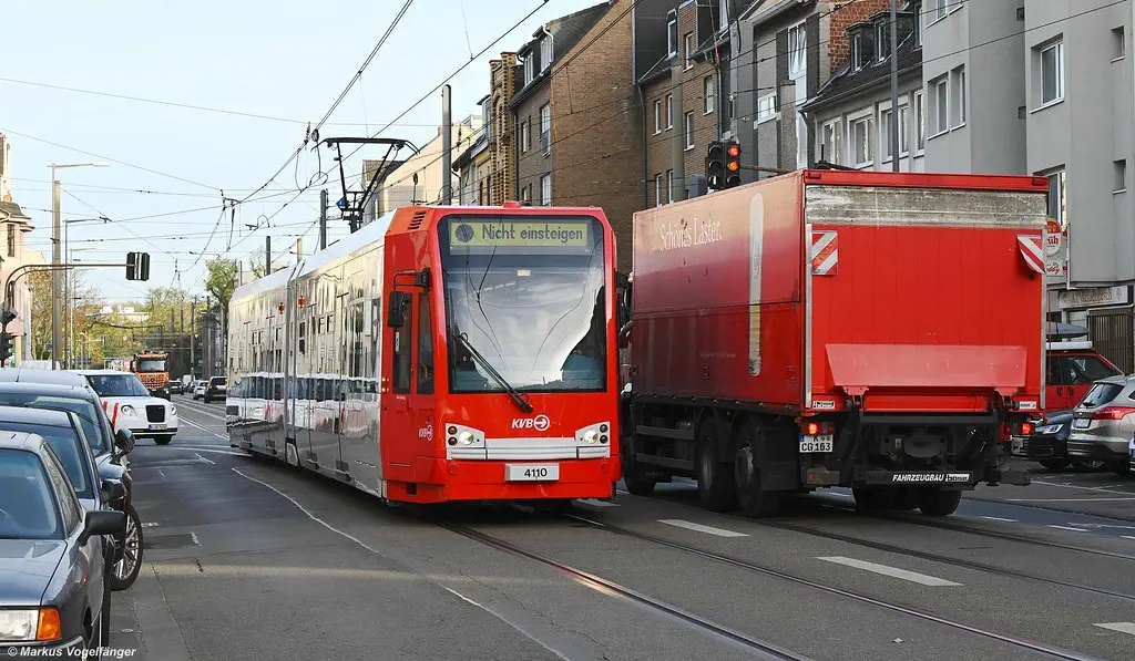 4110 wurde erneut in die aktuellen KVB-Farben lackiert. Hier auf der Neusser Straße am 28.10.2022.