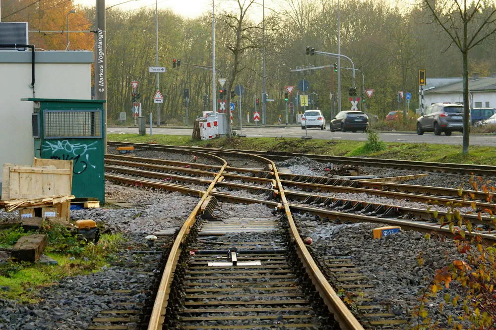 Das mit den Stadtbahngleisen kreuzende Güterzuggleis auf Höhe der Haltestelle Fordwerke Nord am 19.10.2013.
