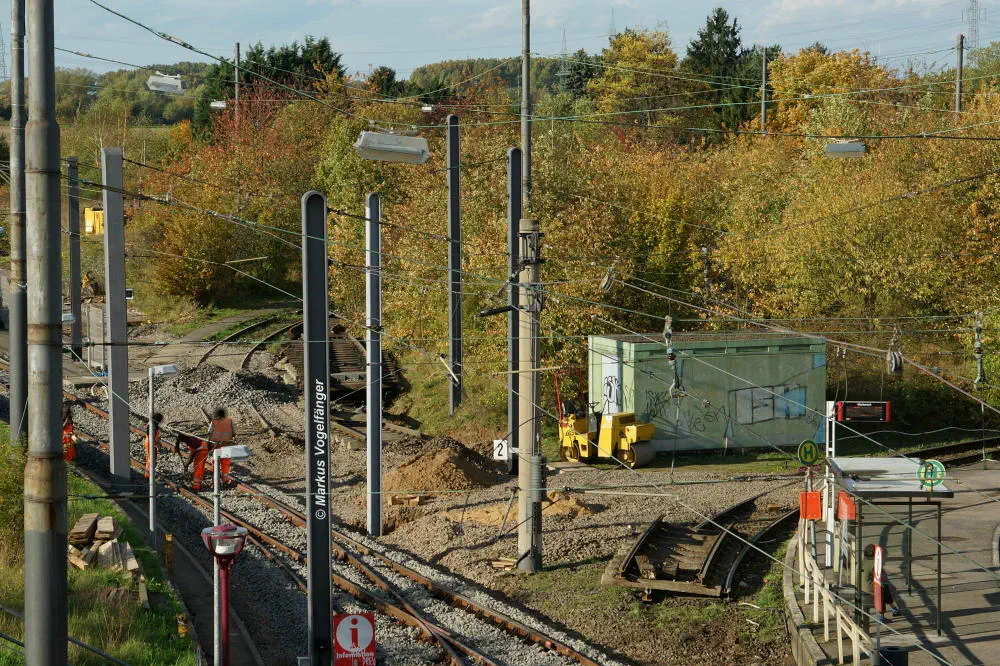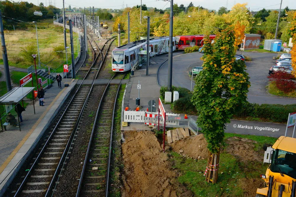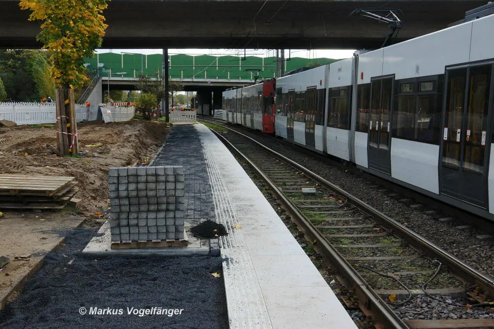 Die Haltestelle Fordwerke Mitte am 19.10.2013. Auf der rechten Seite wurde das Gleisbett bereits mit neuen Schwellen und gereinigtem Schotter versehen.