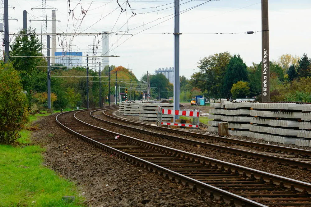 Blick von der Bremerhavener Straße auf die Emdener Straße am 20.10.2013. Das Gleisbett wurde für beide Streckengleise gereinigt und die Schwellen wurden ausgetauscht.