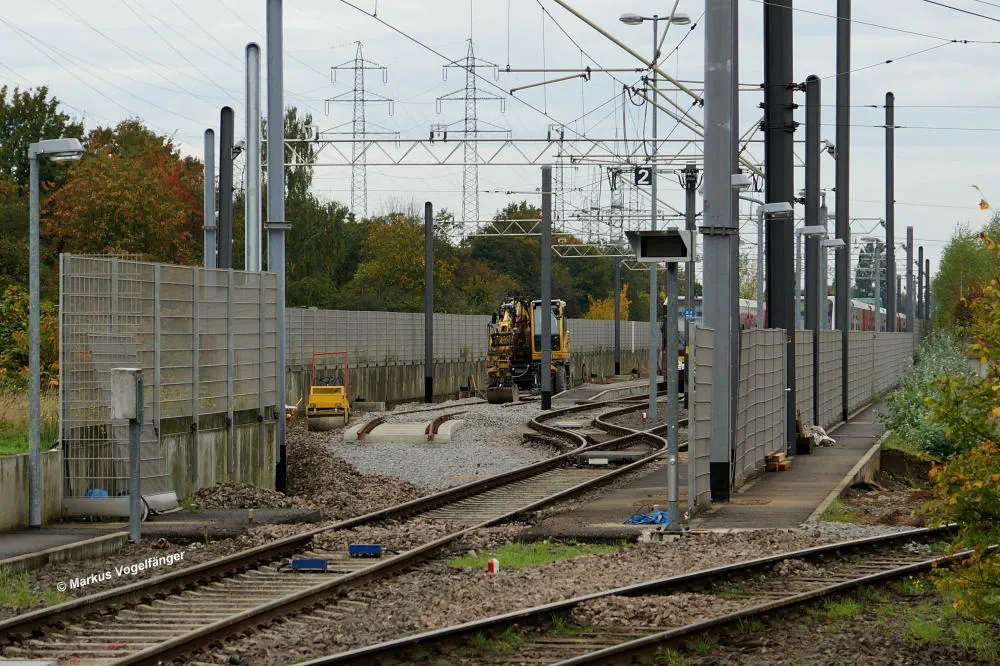 Die Ankunftsbahnsteig Merkenich (im Hintergrund) am 18.10.2013. Er wurde provisorisch um einige Meter Richtung Merkenich Mitte verlegt.