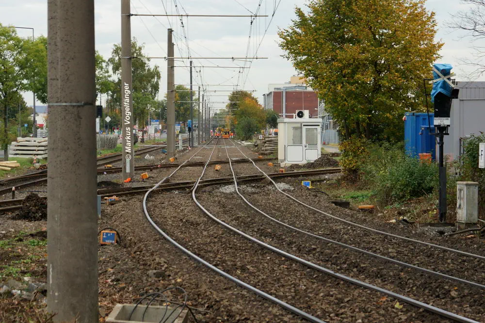 Der aktuelle Bauzustand des Streckenabschnittes zwischen den Haltestellen "Merkenich Mitte" und "Merkenich" am 09.11.2013.