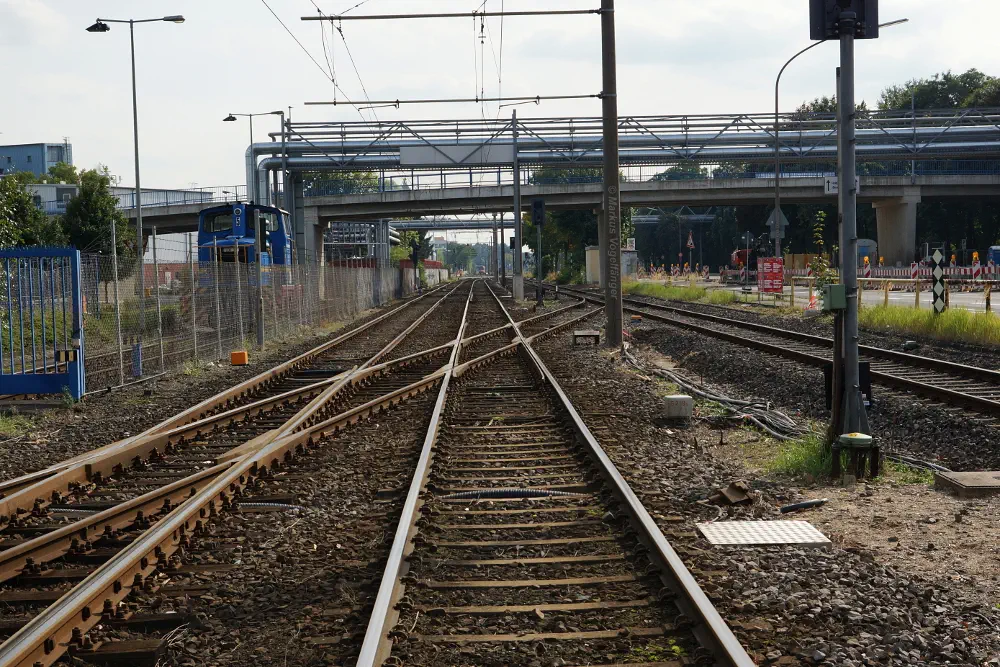 Die Streckengleise der Linie 12 mit zwei zu erneuernden Gleiskreuzungen zwischen den Haltestellen Fordwerke Mitte und Fordwerke Süd (Blickrichtung Fordwerke Süd) am 19.10.2013.
