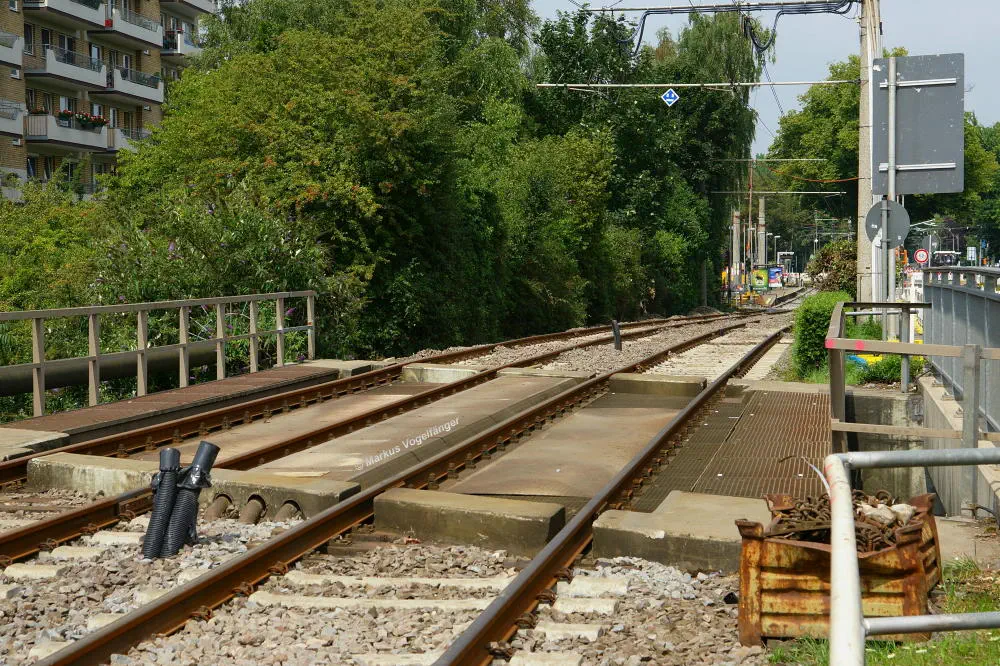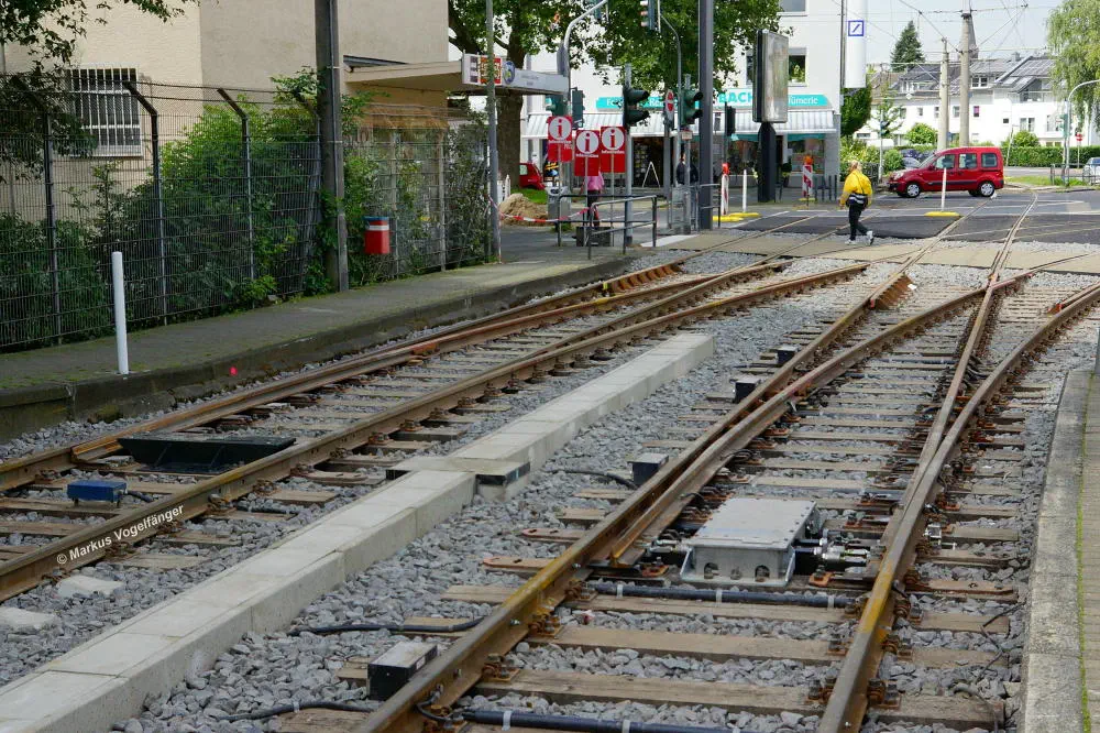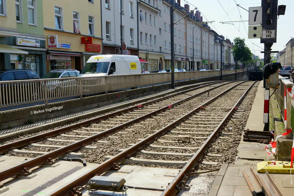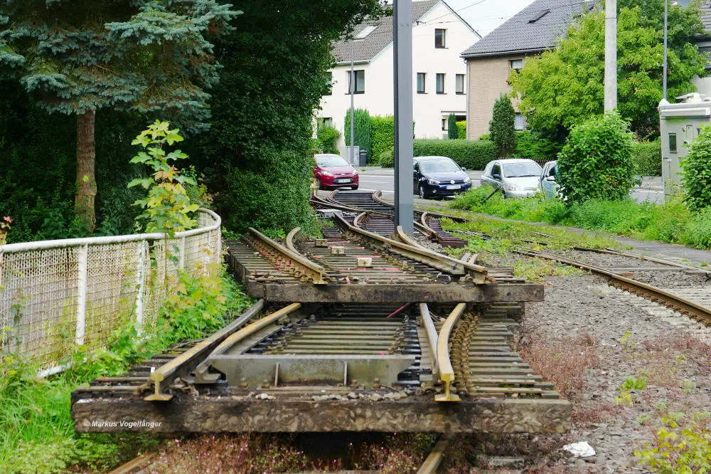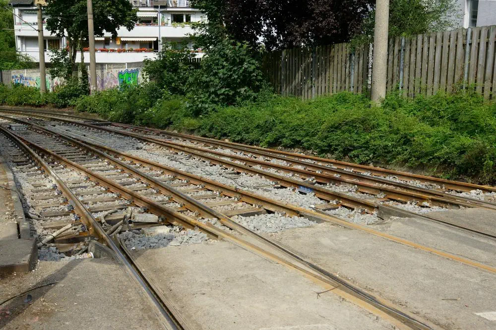 Die entfernten Weichenanlagen vor der Haltestelle Wilhelm-Sollmann-Straße am 07.07.2014.