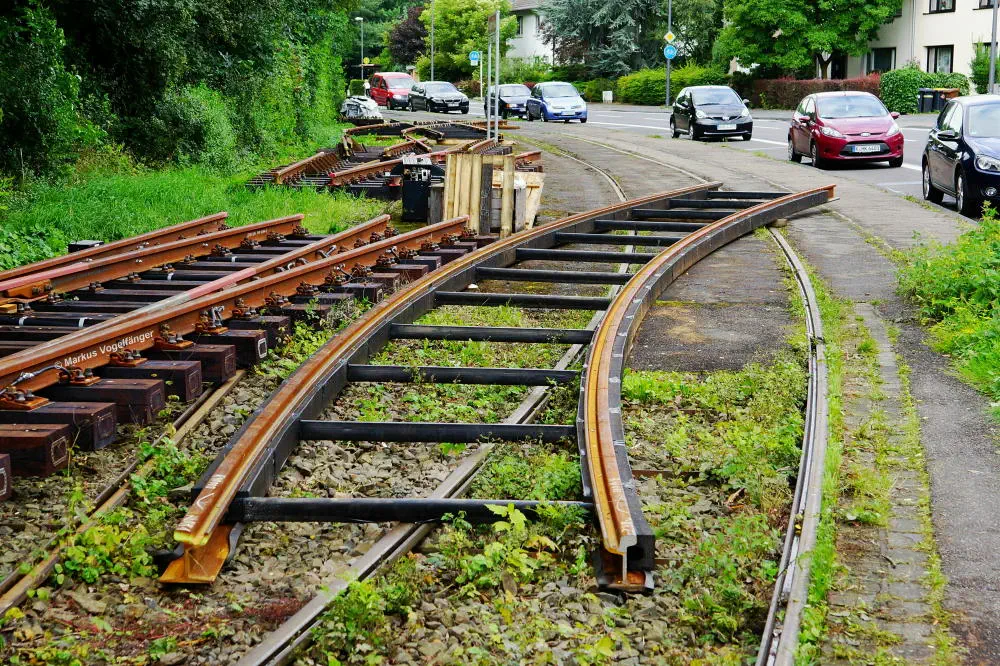 Eine bereits abmontierte Schienenschmieranlage kurz vor der Haltestelle Wilhelm-Sollmann-Straße vor dem Begin der Bauarbeiten am 02.07.2014.