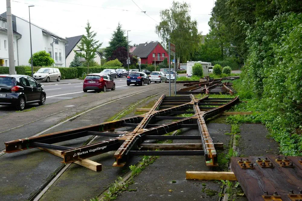 Die alten ausgebauten Weichen von der Kreuzung Longericher Straße/Johannes-Rings-Straße an der Haltestelle "Longerich Friedhof" zwischengelagert am 09.08.2014.