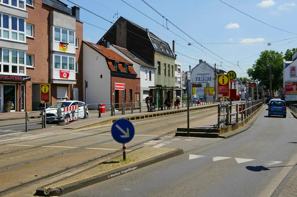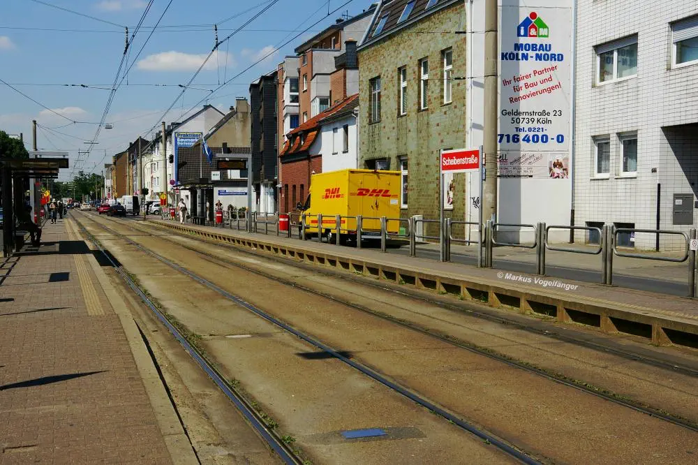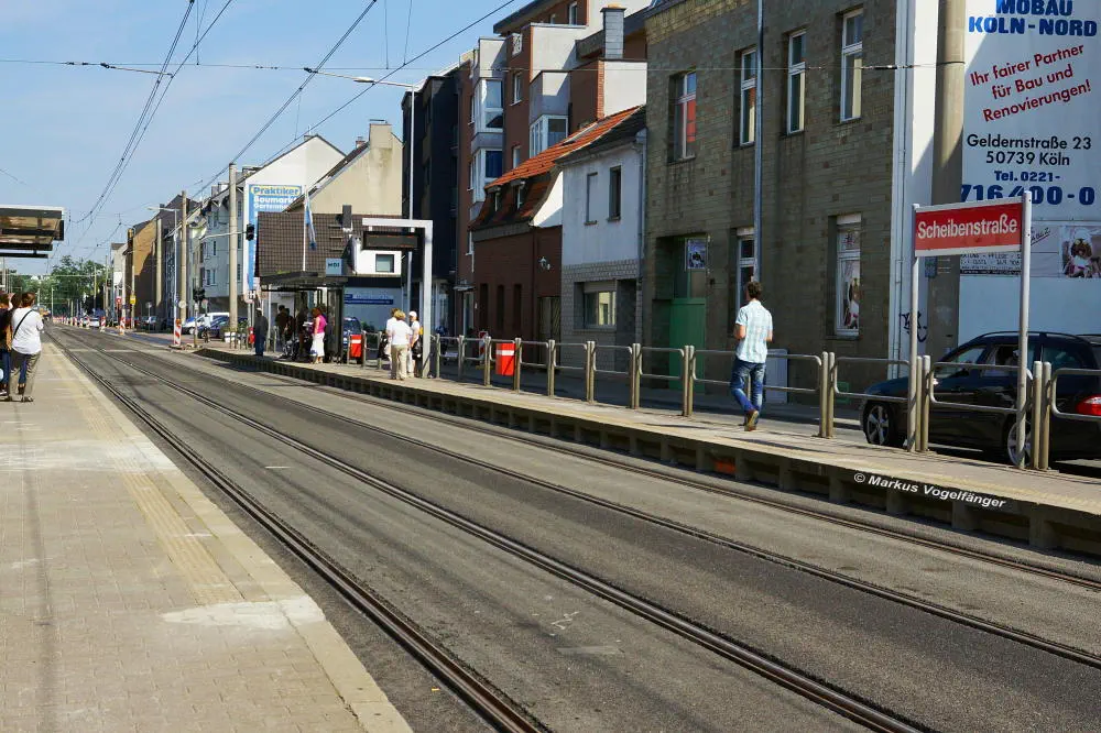 Die Haltestelle Scheibenstraße auf der Neusser Straße vor dem Beginn der Bauarbeiten am 02.07.2014.