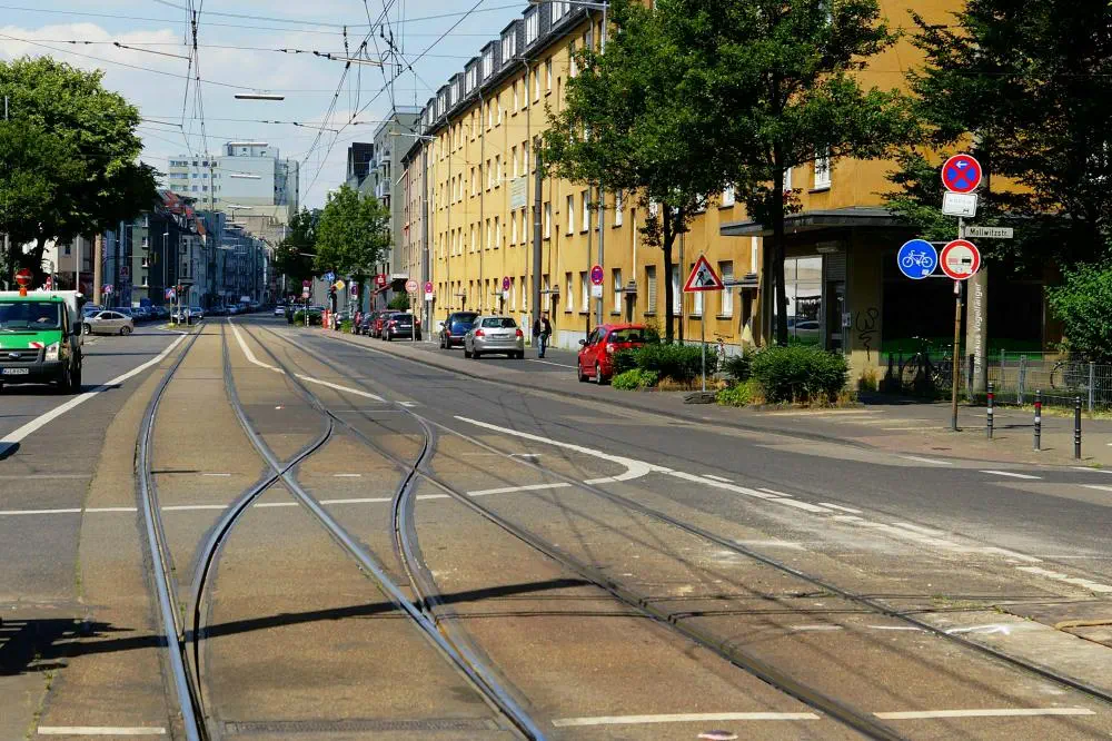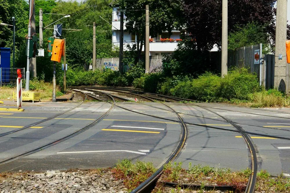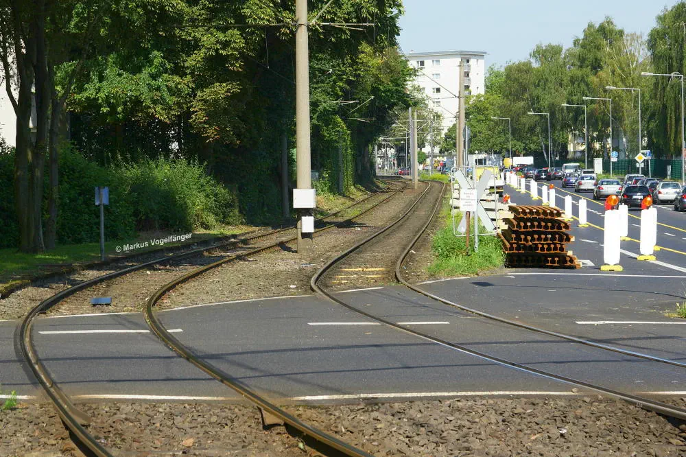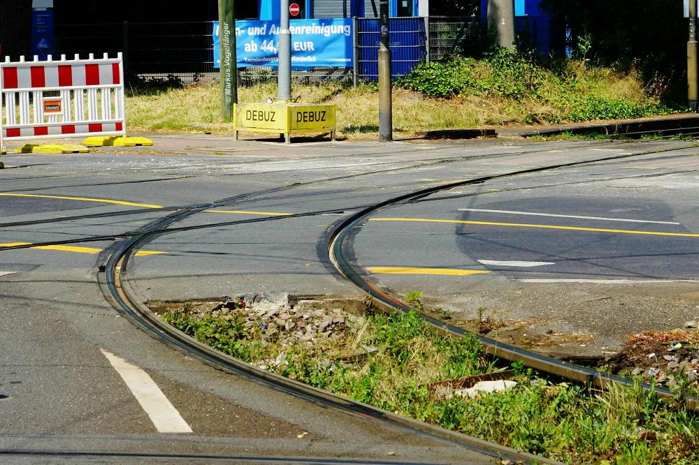 Das Gleiskreuz Wilhelm-Sollmann-Straße/Neusser Straße vor Beginn der Bauarbeiten am 02.07.2014.