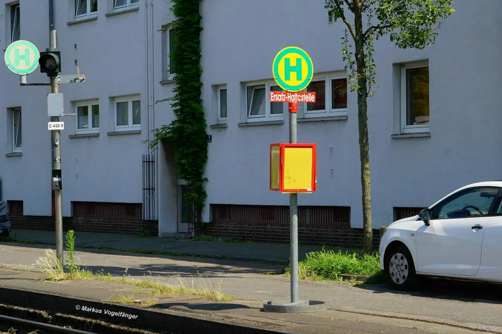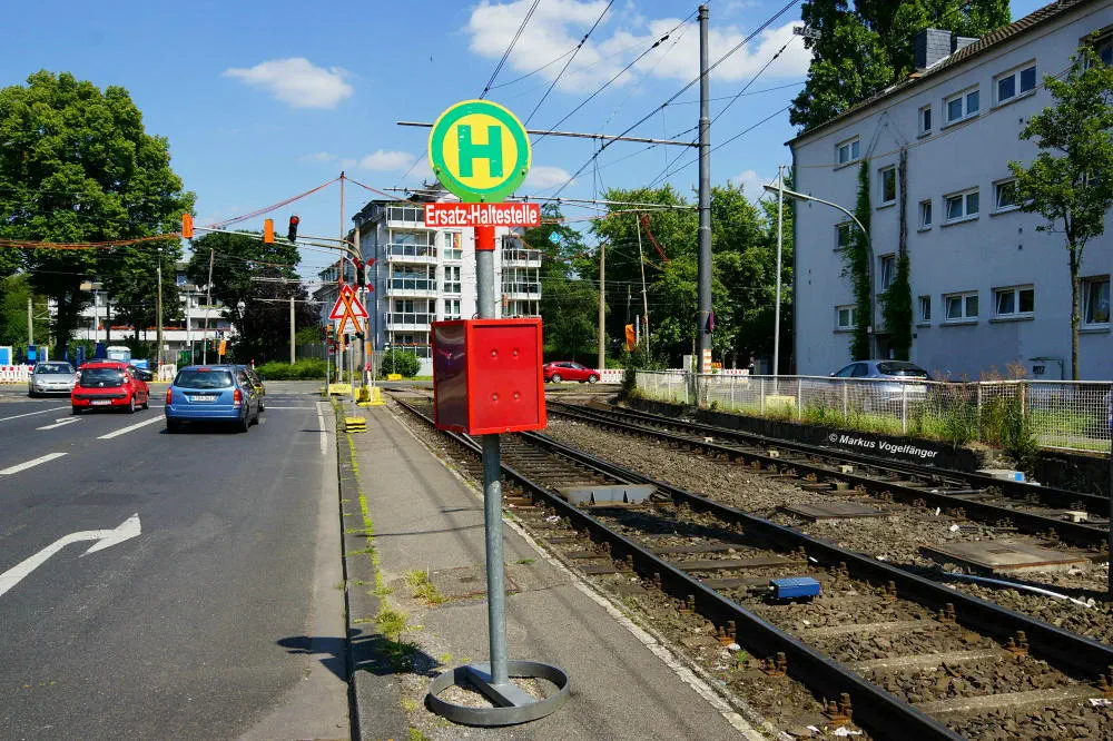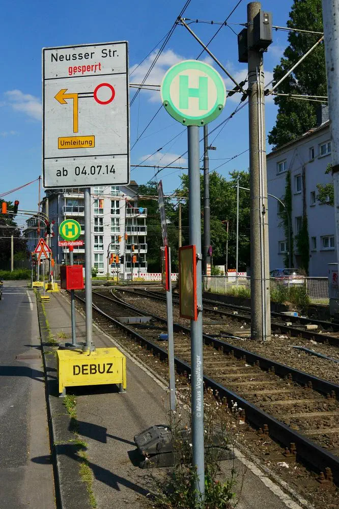 Die provisorische Haltestelle Wilhelm-Sollmann-Straße vor Beginn der Bauarbeiten am 02.07.2014.