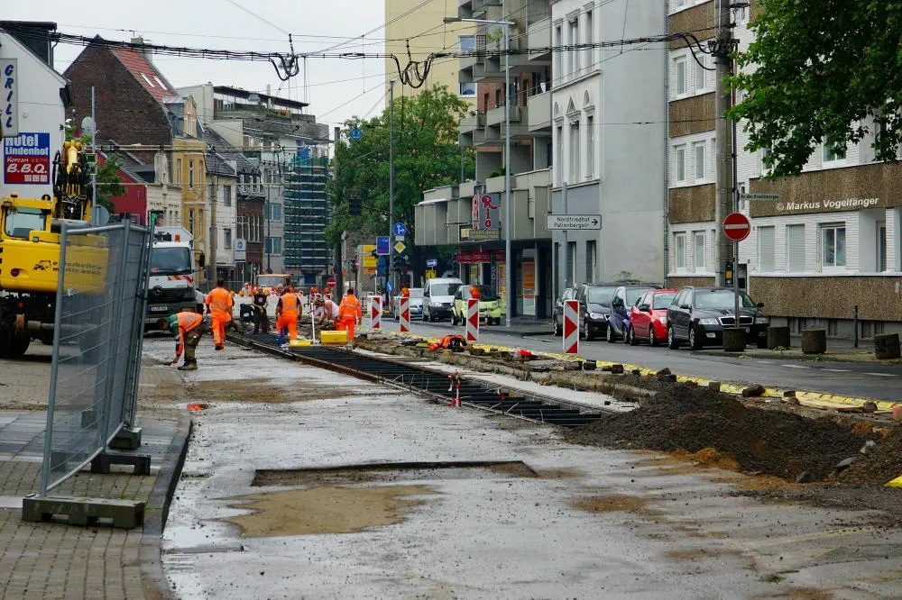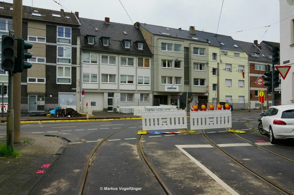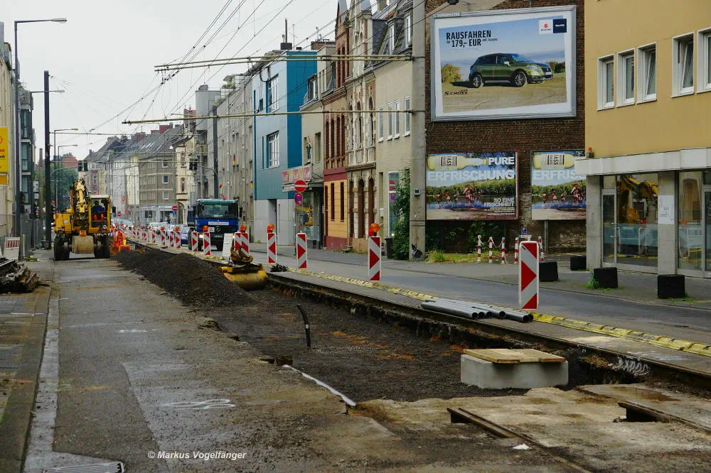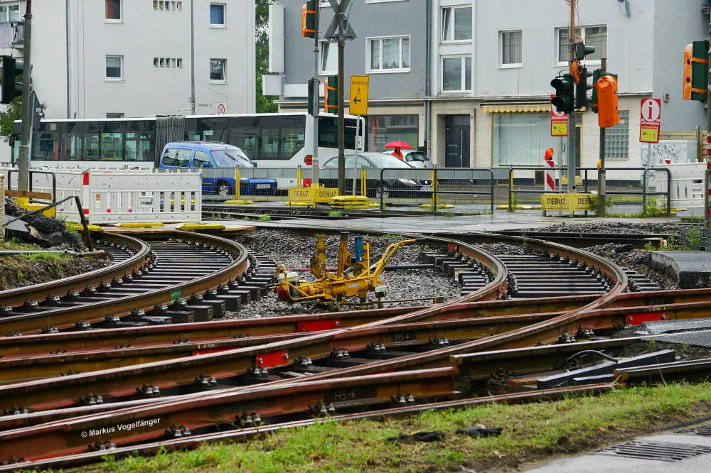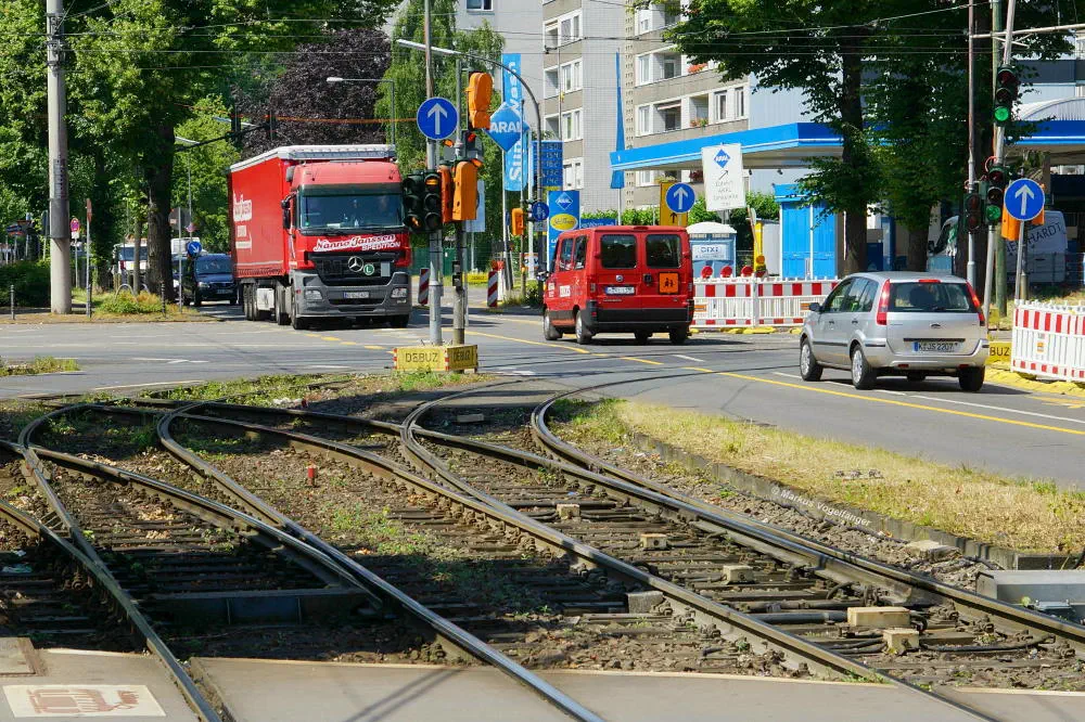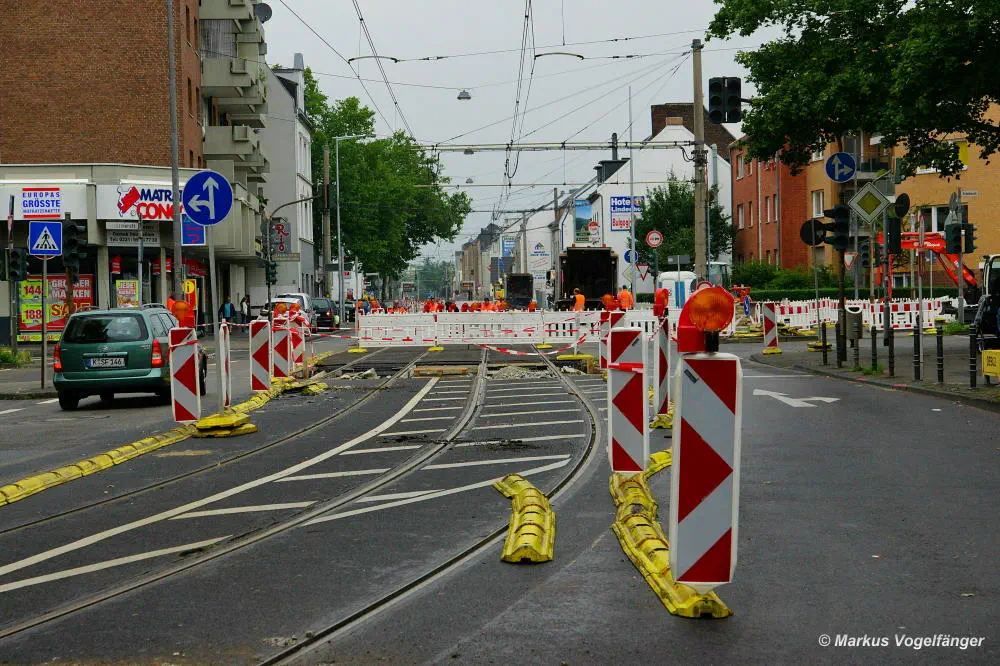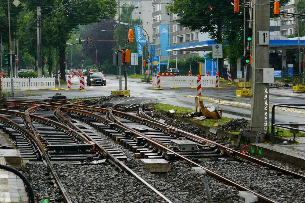 Das Gleiskreuz Wilhelm-Sollmann-Straße/Neusser Straße während Bauphase 1 am 05.07.2014.