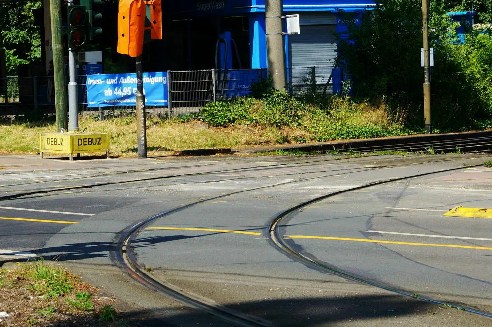 Der Gleiswechsel auf der Neusser Straße in Höhe der Haltestelle Mollwitzstraße vor dem Beginn der Bauarbeiten am 02.07.2014.