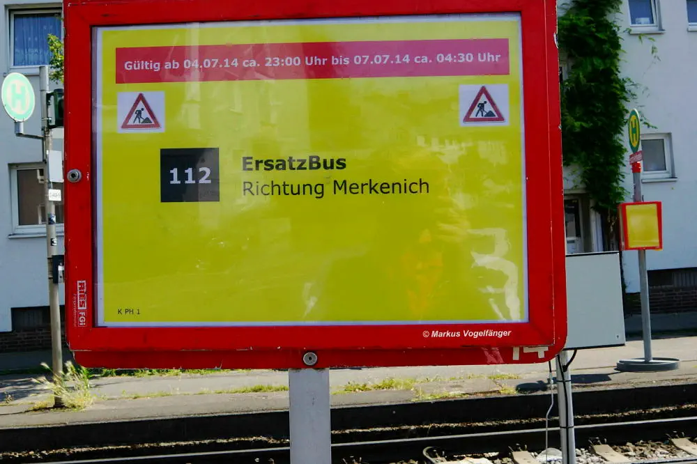 Informationstafeln an der Haltestelle Wilhelm-Sollmann-Straße vor dem Beginn der Bauarbeiten am 02.07.2014.
