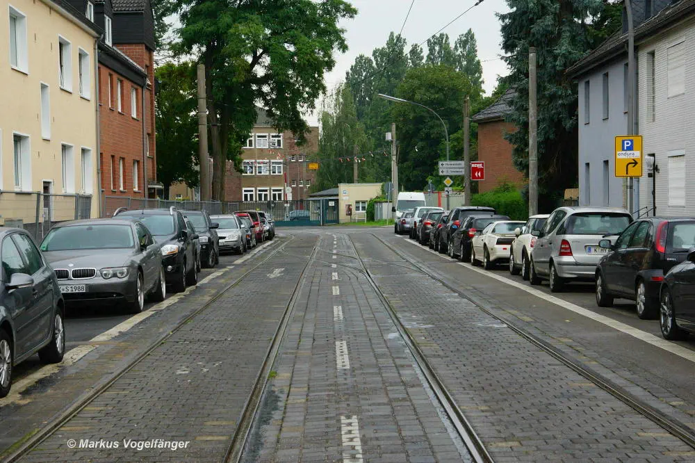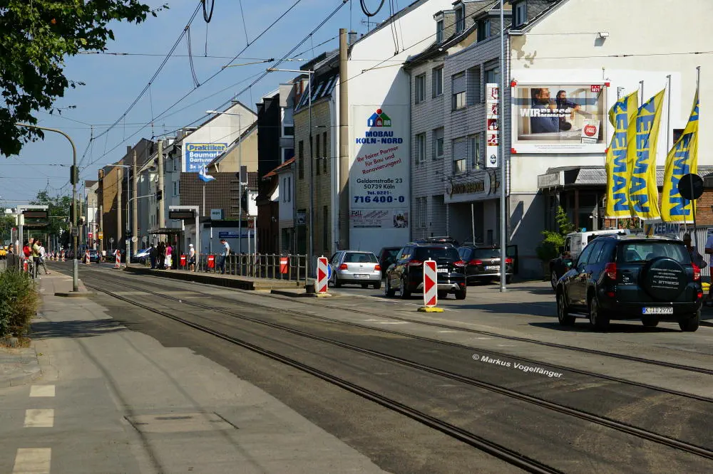 Die erneuerten Gleisanlagen auf der Longericher Straße zwischen den Haltestelle "Longericher Straße" und "Heimersdorf" am 09.08.2014.