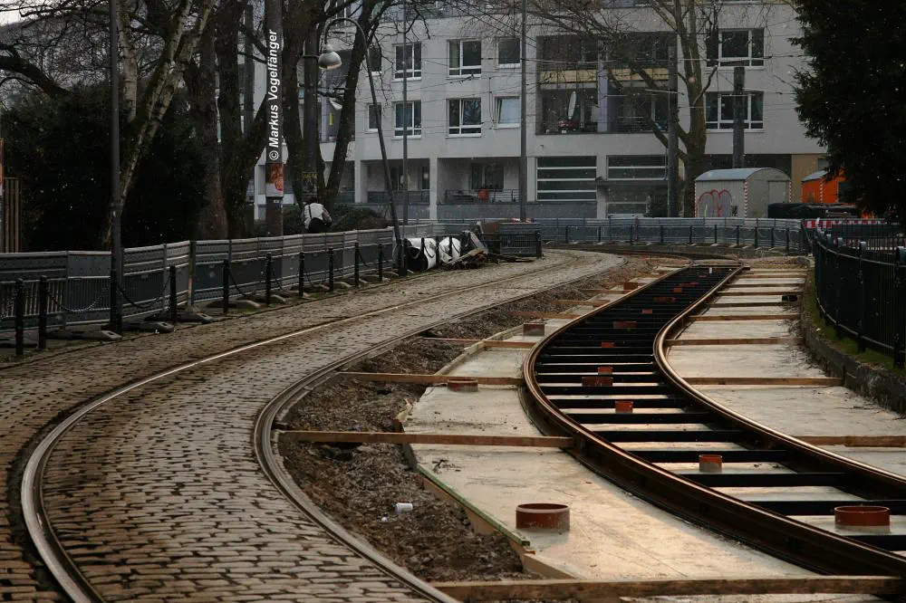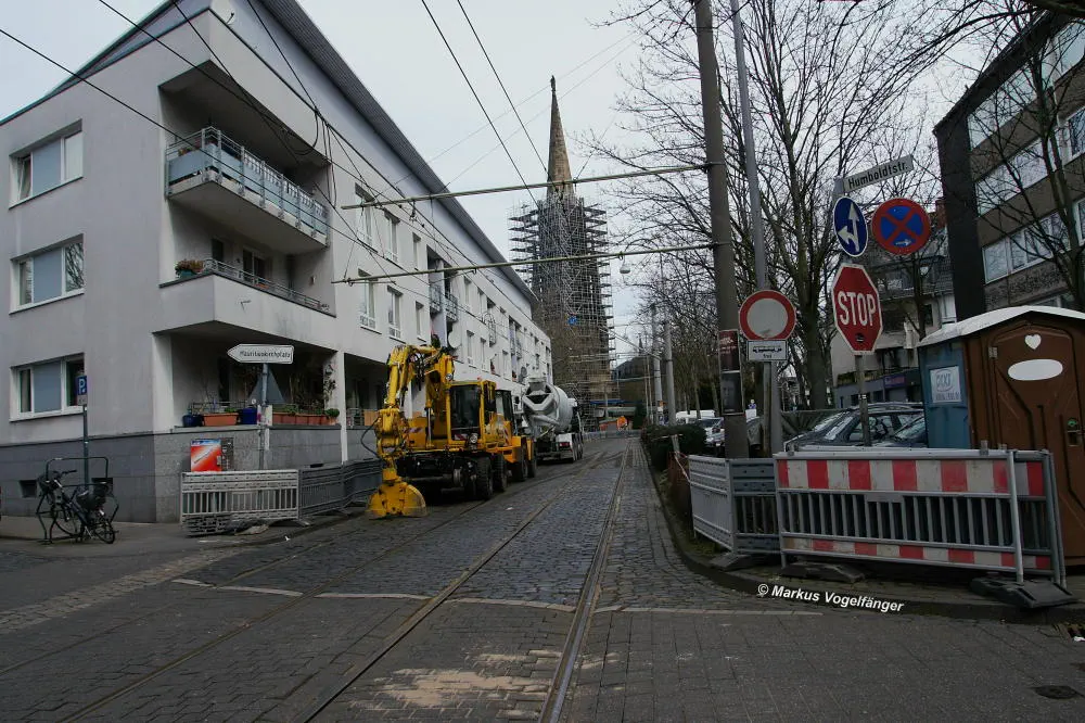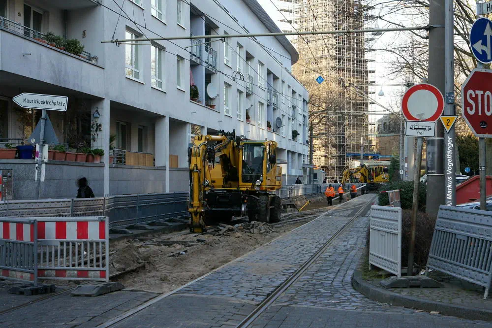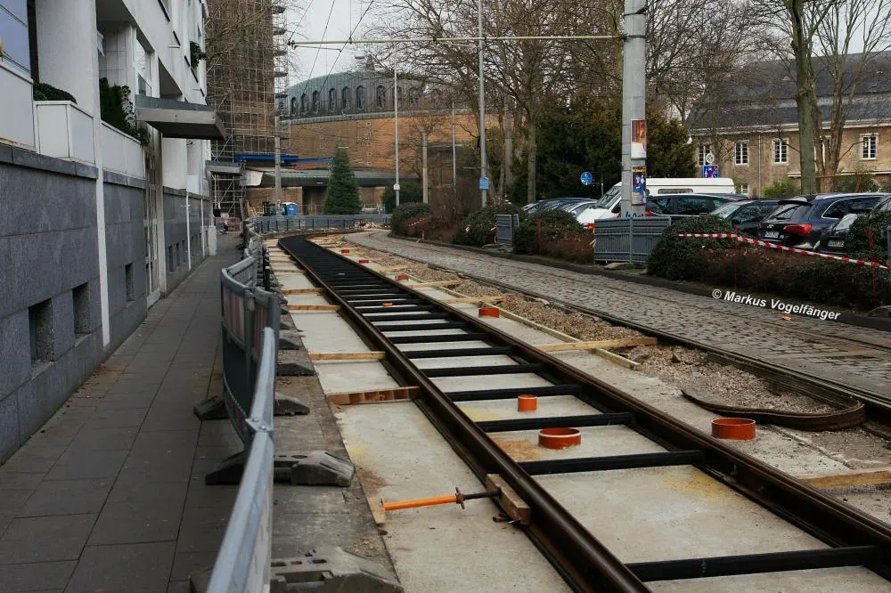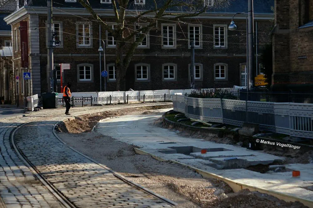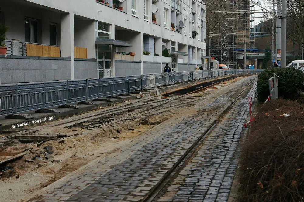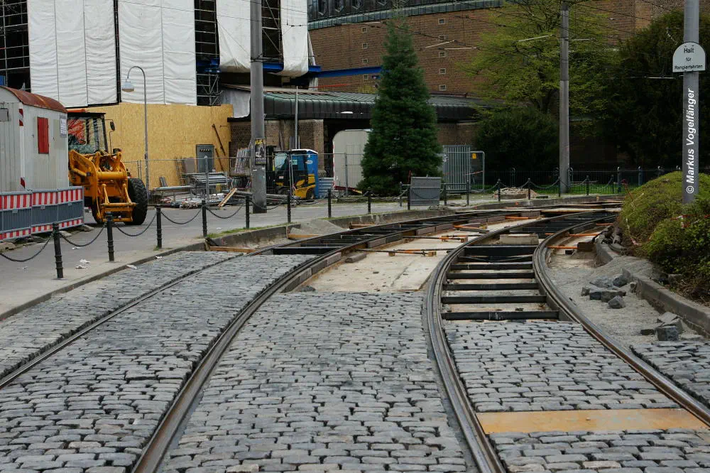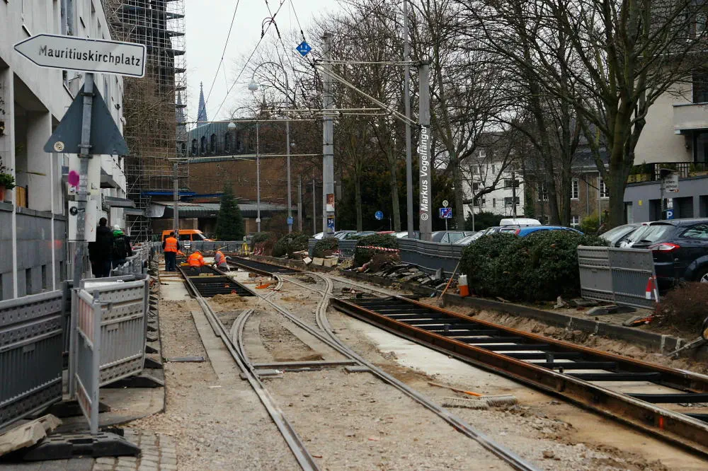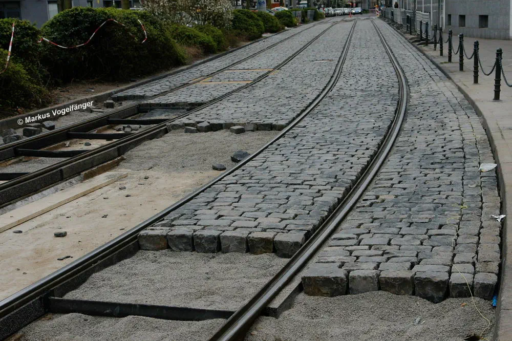 Nachdem die Gleise an der Mauritiuskirche neu verlegt worden sind und der Stadtbahnbetrieb wieder aufgenommen wurde, wird das Natursteinplaster aus Blaubasalt welches im Rahmen der Bauarbeiten entfernt wurde, nun bis Ende Mai 2013 wieder eingebaut.