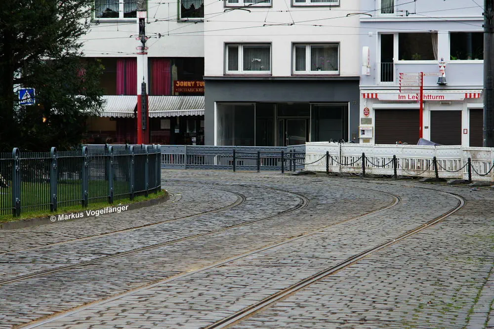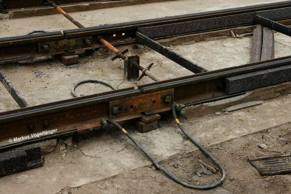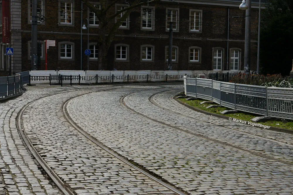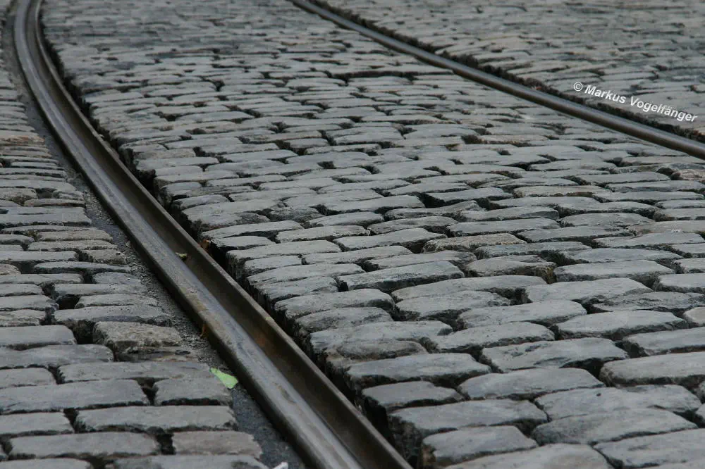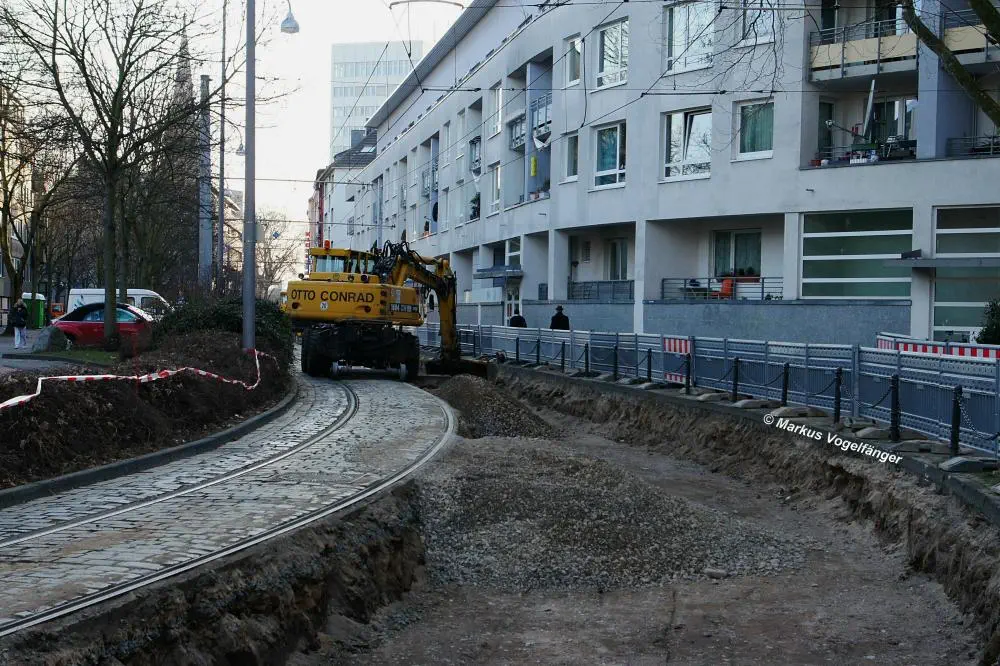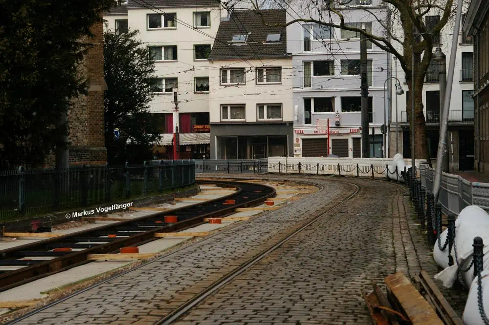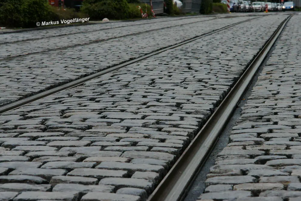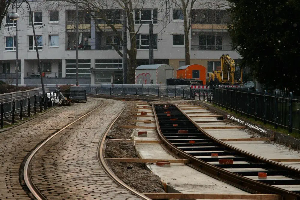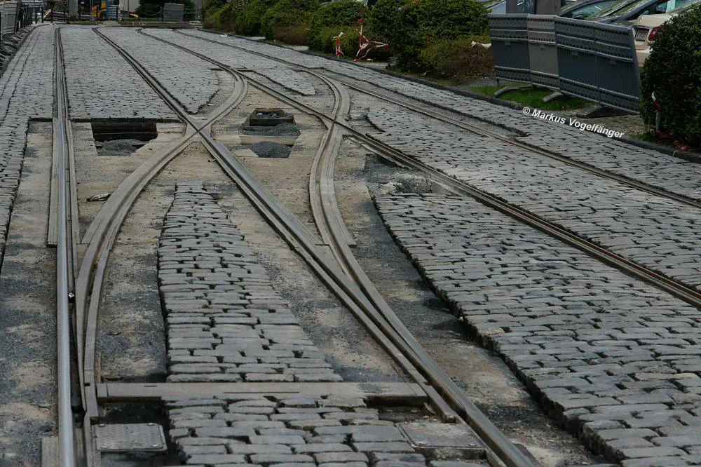 Nachdem die Gleise an der Mauritiuskirche neu verlegt worden sind und der Stadtbahnbetrieb wieder aufgenommen wurde, wird das Natursteinplaster aus Blaubasalt welches im Rahmen der Bauarbeiten entfernt wurde, nun bis Ende Mai 2013 wieder eingebaut.
